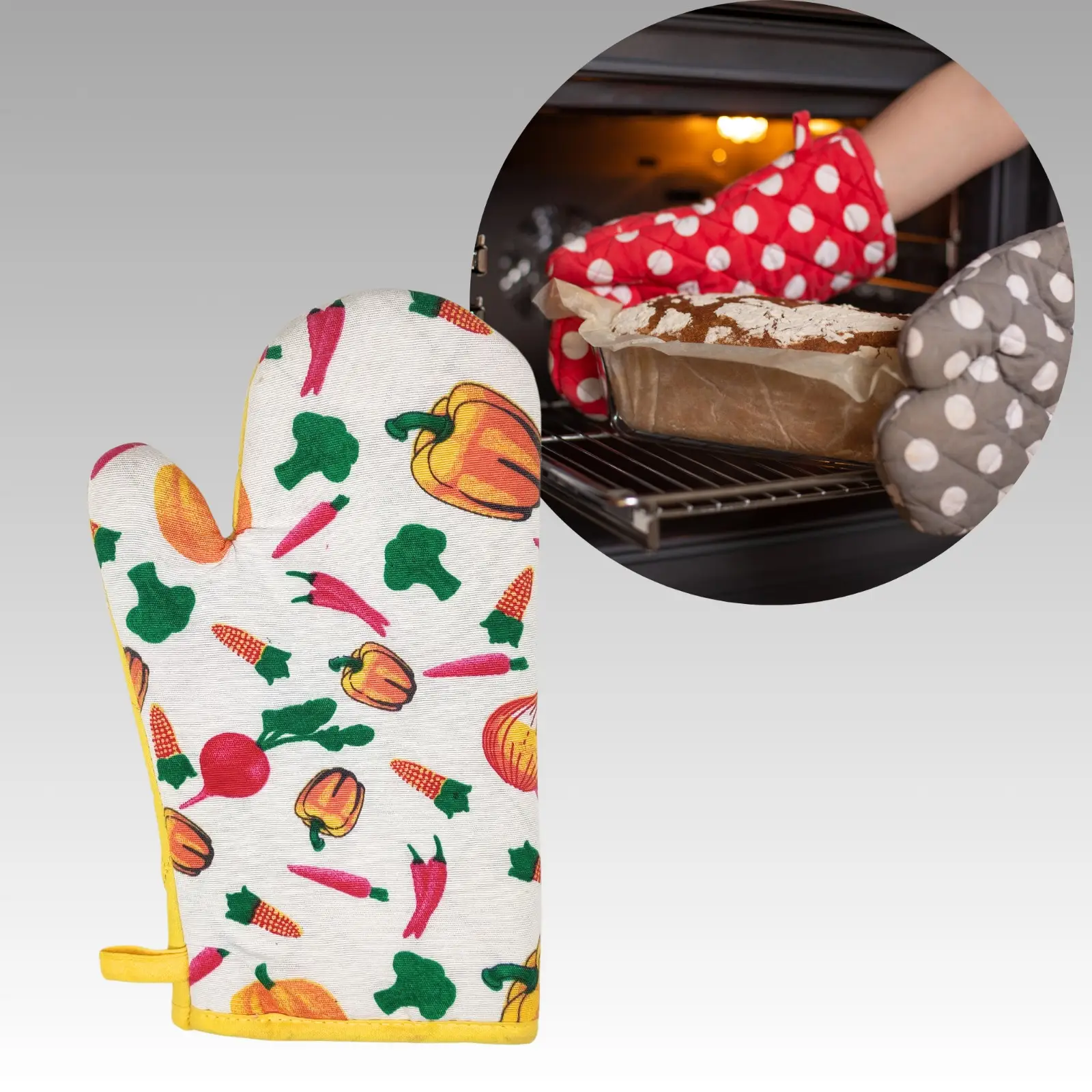 Ensure safety and comfort in the kitchen with this 1 pair of high-quality oven gloves. Made with heat-resistant materials, these gloves provide excellent protection from hot surfaces, whether you're baking, cooking, or grilling. The non-slip grip ensures secure handling of hot items, while the durable and flexible fabric allows easy movement. Lightweight, stylish, and easy to clean, these gloves are perfect for everyday use, making them an essential addition to your kitchen accessories. Keep your hands safe and enjoy worry-free cooking!