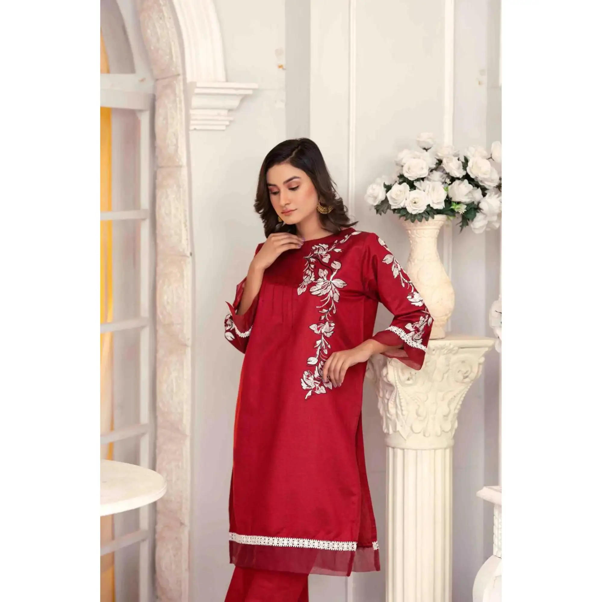 A ready-to-wear ensemble crafted from premium quality viscose fabric. The shirt included in this set boasts intricate embroidery, adding a touch of elegance to the suit. The plain trousers complement the shirt perfectly, creating a polished look. This suit does not include a dupatta, giving you the freedom to accessorize as you wish. Perfect for any formal or semi-formal occasion, this suit is sure to make a lasting impression with its premium fabric. Upgrade your wardrobe with this luxurious piece today.