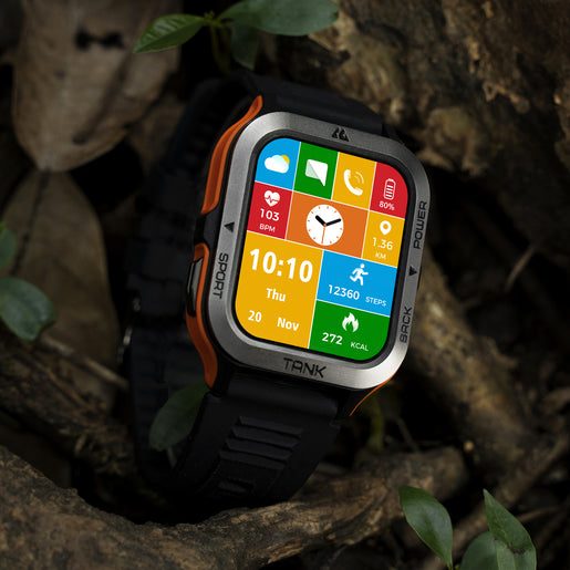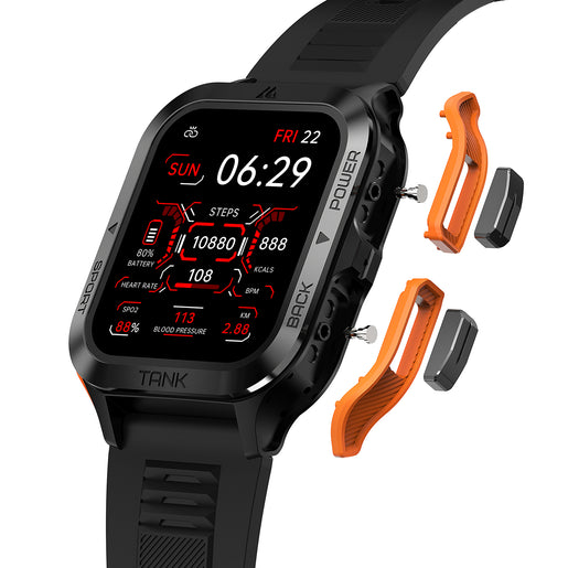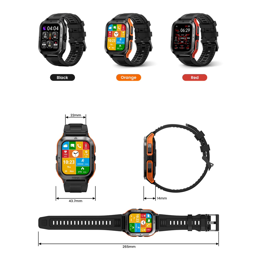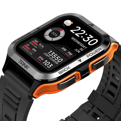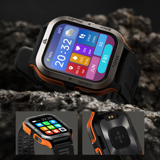 TANK M2 marries outdoor sports design with our self-produced, two-colour liquid silicone rubber mold. Its side body is embellished with colour-blocking soft silicone rubber, making it a vibrant rugged smartwatch.