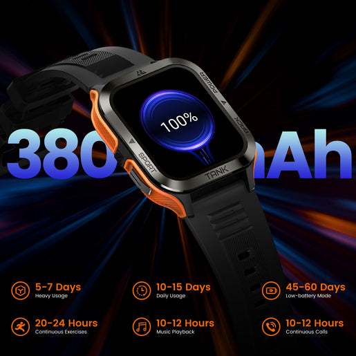 Besides its 380mAh pure cobalt battery with high capacity and voltage, TANK M2 adopts a double-mode, single-chip processor to minimize power consumption. Enabled by our extraordinary software algorithms, the smartwatch ensures long-lasting battery life, 50-day standby time and 20 days for daily usage.