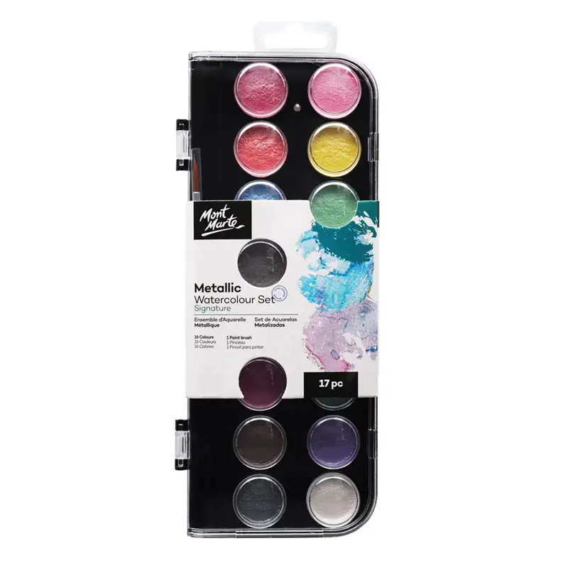 The Mont Marte Metallic Watercolour Set is a stunning collection of metallic watercolours that add a touch of shimmer and shine to your artworks. This set includes 17 vibrant metallic shades, providing a wide range of options to bring brilliance and luminosity to your paintings.
