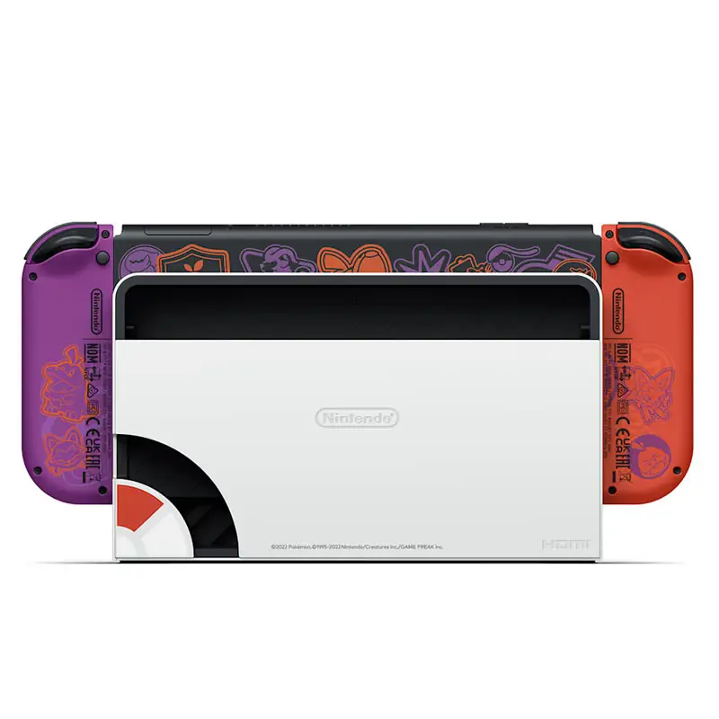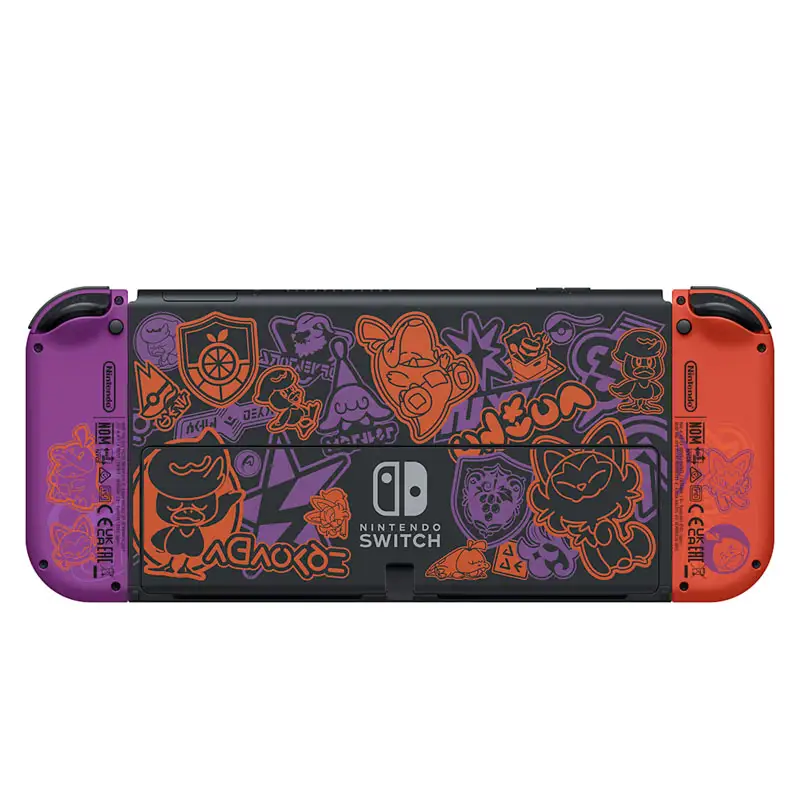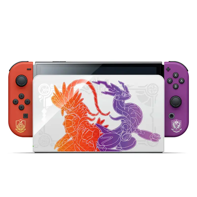 The Nintendo Switch â OLED Model: Pokémon Scarlet & Violet Edition system features special illustrations of the Legendary Pokémon appearing in the Pokémon Scarlet and Pokémon Violet games, Koraidon and Miraidon, as well as the partner Pokémon Sprigatito, Fuecoco, and Quaxly.