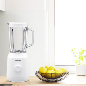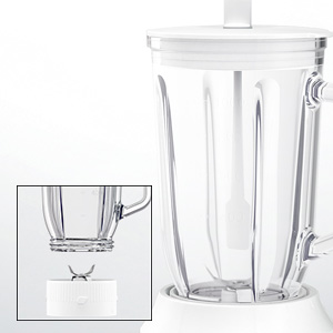 Easy-to-wash glass jug resists odors and stainsThe blender jug is made of transparent glass that resists odors, scratching, stains and discoloration, even with long-term use. The jug and blade base are detachable as separate units for convenient cleaning. Even fibrous pulp can be easily washed away. | Built for safe, long-term use by the entire familyA safety lock prevents the blender from being switched on if the jug or mill is not properly positioned. The blades will not rotate unless the blade base is securely set in place. Operation stops automatically if the motor is overloaded*, preventing possible damage to the blender. *Too many ingredients, not enough liquid, etc. | The sleek design accents any kitchen interiorThe white color gives a clean, fresh appearance. The sleek, minimalist body coordinates well and makes a handsome addition to your kitchen décor. An attractively slim, space-saving design that takes up little space on the kitchen counter and stores easily. |