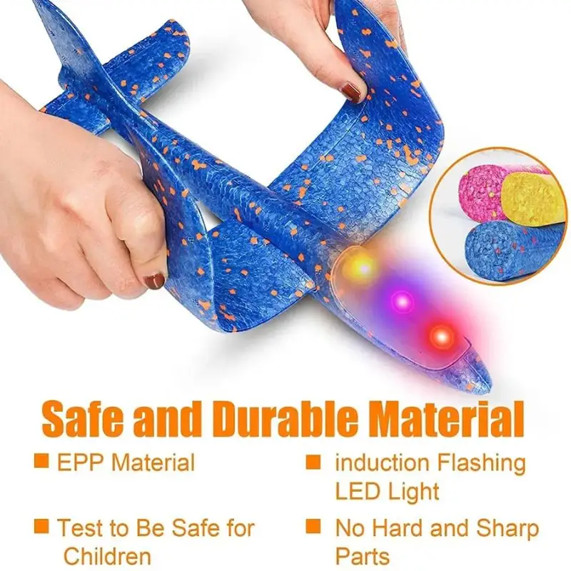 - ã3 Pack LED Airplane Launcher SetãThe Glider Airplane toys are equipped with 3 foam planes, 1Ã launcher, 3ÃDIY stickers. Throwing the foam planes by hand or flying them with launcher, kids can cultivate their hand-eye coordination, observation, and sense of direction. These Flying Airplane is made of high-quality foam that is safe and environmentally friendly. It is lightweight, impact-resistant, and has smooth edges with no hard or sharp parts, very safe for kids/ children to play with.