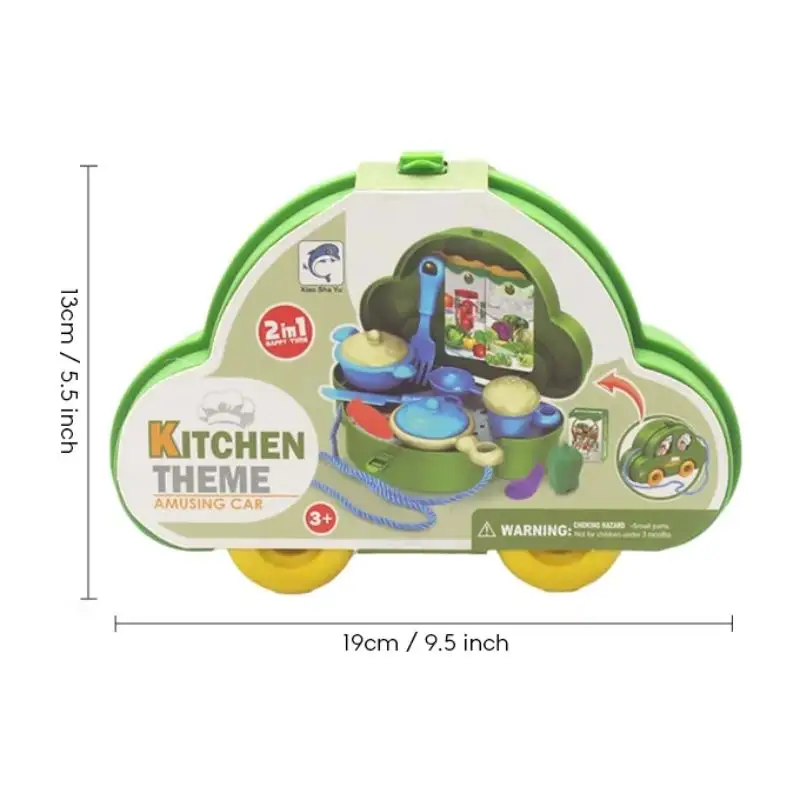 The â2 in 1 Happy Times Kitchen Theme Amusing Briefcase Car Set â Size Approx. 8 inch â Kitchen Mini Briefcase Car â Greenâ is an extraordinary toy that will bring joy and excitement to childrenâs playtime. With its unique and versatile design, this toy offers a delightful combination of a kitchen theme and a briefcase car, providing endless possibilities for imaginative play. Imagine a world where children can become aspiring chefs and adventurous drivers all in one playset. This toy is designed to ignite their imagination and transport them to a world of creative possibilities. The vibrant and cheerful kitchen theme captures their attention, making them feel like they are in a real kitchen, ready to cook up a storm. The set includes various kitchen accessories such as pots, pans, utensils, and food items, allowing children to engage in role-playing activities and pretend to prepare delicious meals for their friends and family. But thatâs not all! This toy goes above and beyond by incorporating an amusing briefcase car. The green briefcase unfolds to reveal a miniature car with wheels and a handle, transforming the play experience into an exciting adventure. Children can switch gears from being a chef to a driver with a simple transformation, enhancing their mobility and adding an element of surprise to their playtime. They can zip around the room, taking their imaginative journey to new heights. Measuring approximately 8 inches, this toy is compact and portable, making it ideal for play on the go. Children can easily carry it around like a briefcase, enabling them to take their favorite toy wherever they desire. Whether itâs a family vacation, a playdate at a friendâs house, or a trip to the park, this toy ensures that fun is always within reach. Not only does this toy provide endless entertainment, but it also offers numerous educational benefits. As children engage in imaginative play, they develop essential skills such as fine motor skills, hand-eye coordination, and cognitive abilities. Through role-playing activities, they learn about kitchen tools, food, and different aspects of daily life, enhancing their knowledge and understanding of the world around them. Safety is a top priority, and this toy is designed with that in mind. It is made from durable materials to withstand the rigors of play, ensuring that it will last for countless play sessions. The toy features rounded edges and non-toxic components, providing a safe and worry-free play experience for children. In summary, the 2 in 1 Happy Times Kitchen Theme Amusing Briefcase Car Set â Size Approx. 8 inch â Kitchen Mini Briefcase Car â Green is a truly exceptional toy. It combines the joy of a kitchen playset with the excitement of a briefcase car, creating a dynamic and engaging play experience. This toy sparks childrenâs imagination, encourages social interaction and cooperation, promotes educational development, and provides endless hours of fun. Itâs a must-have toy that will bring happiness and amusement to childrenâs playtime, inspiring them to explore their creativity and embark on exciting adventures.