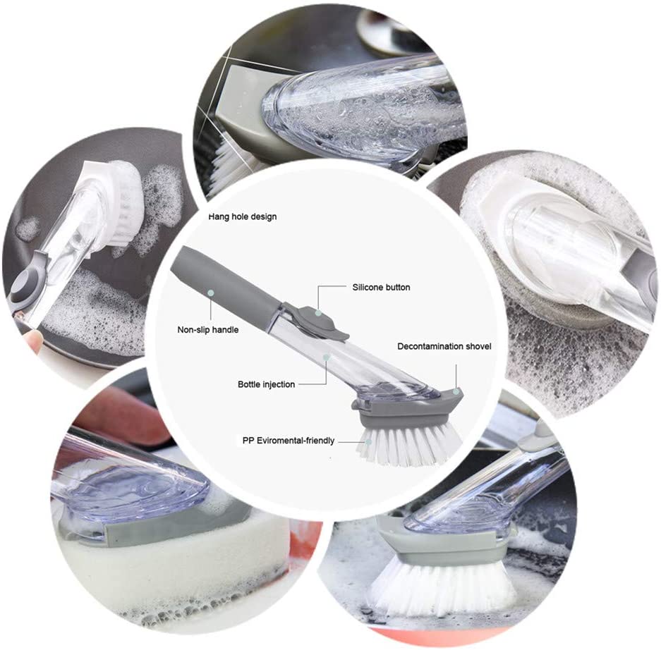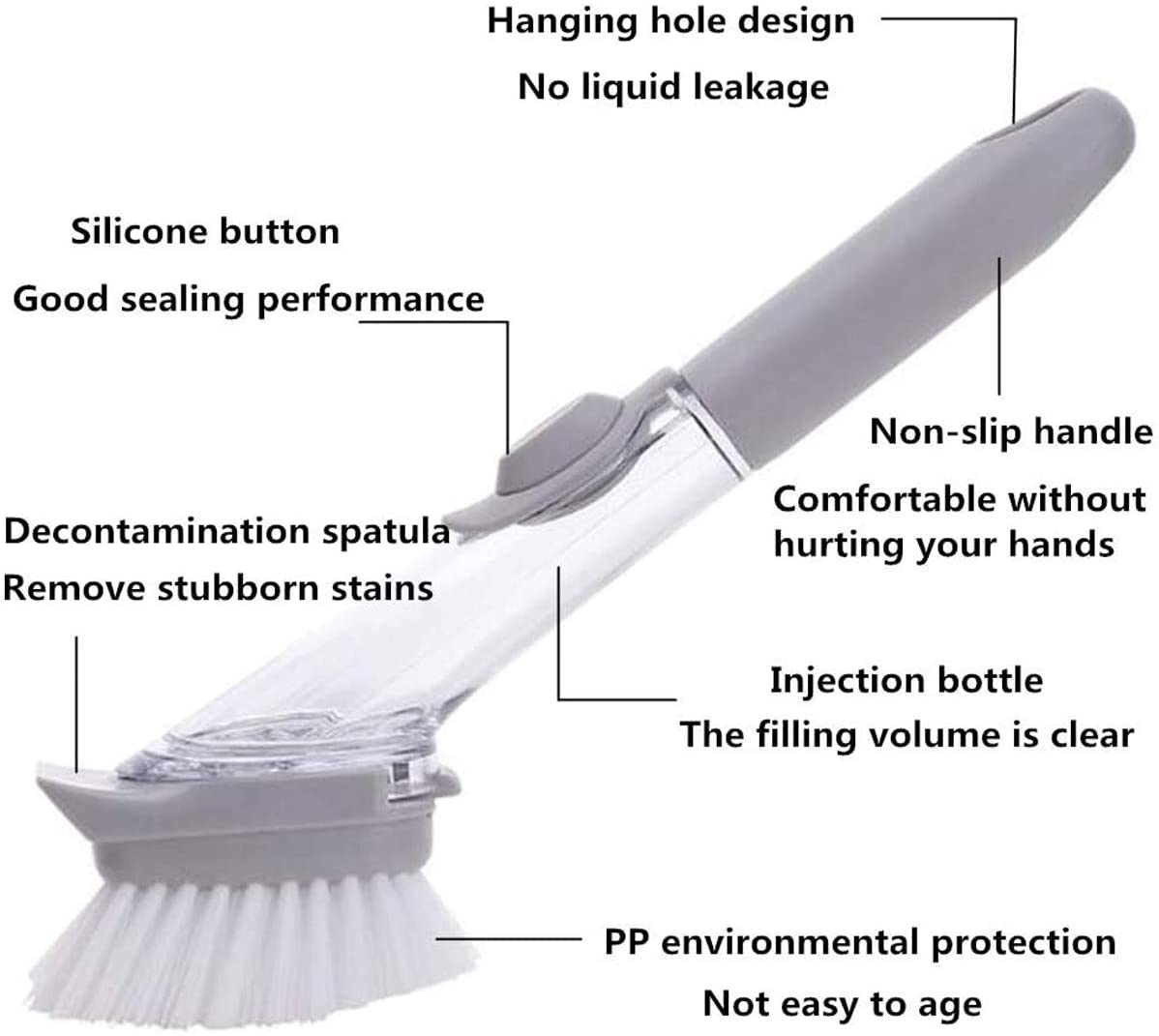 - The cleaning brush is very simple for you to add cleaning fluid inside the brush and make the household cleaning easily. Just push the button of the kitchen scrubber and it will dispense soap automatically.