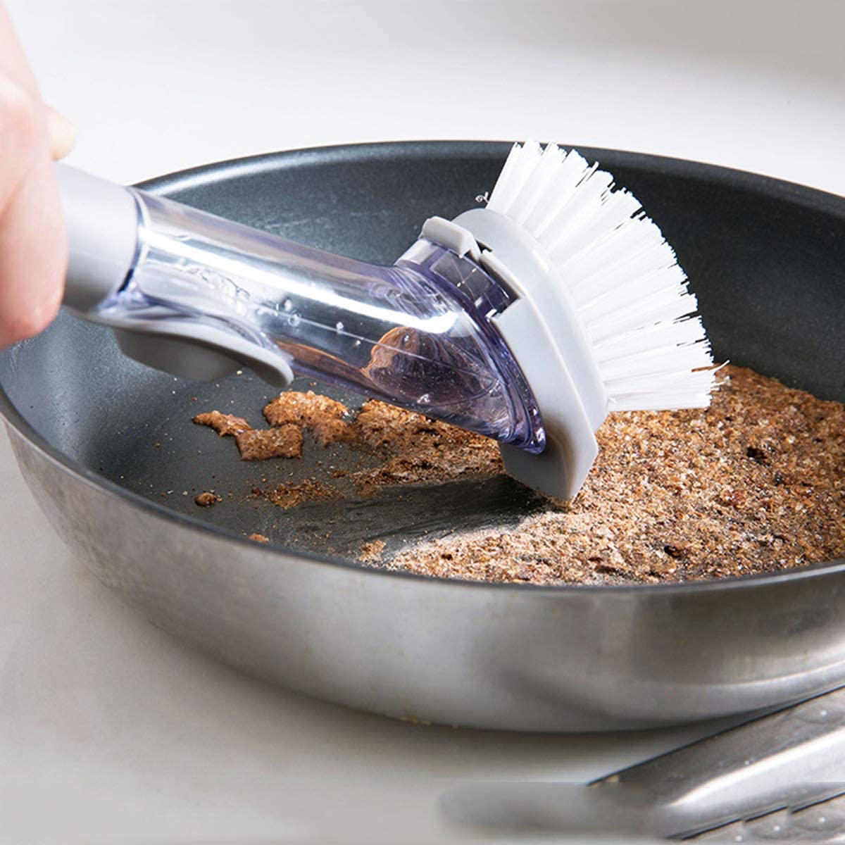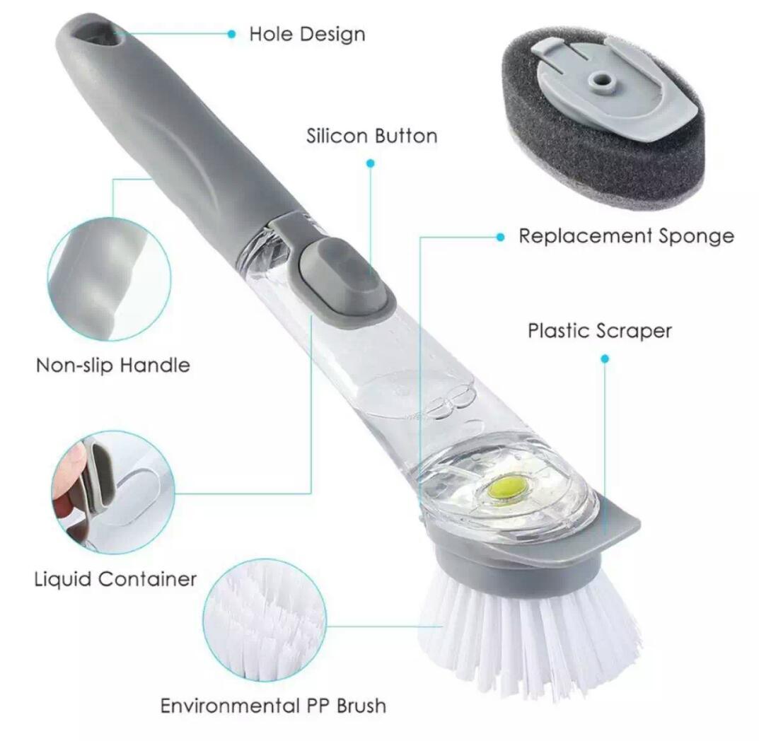 - The kitchen dish brush is easily removing the bake on the pot with scrubber on backside of the brush end even you donââ¬â¢t need to change your cleaning tools. Automatic soap dispensing can avoid the waste of clean fluid and save your money.