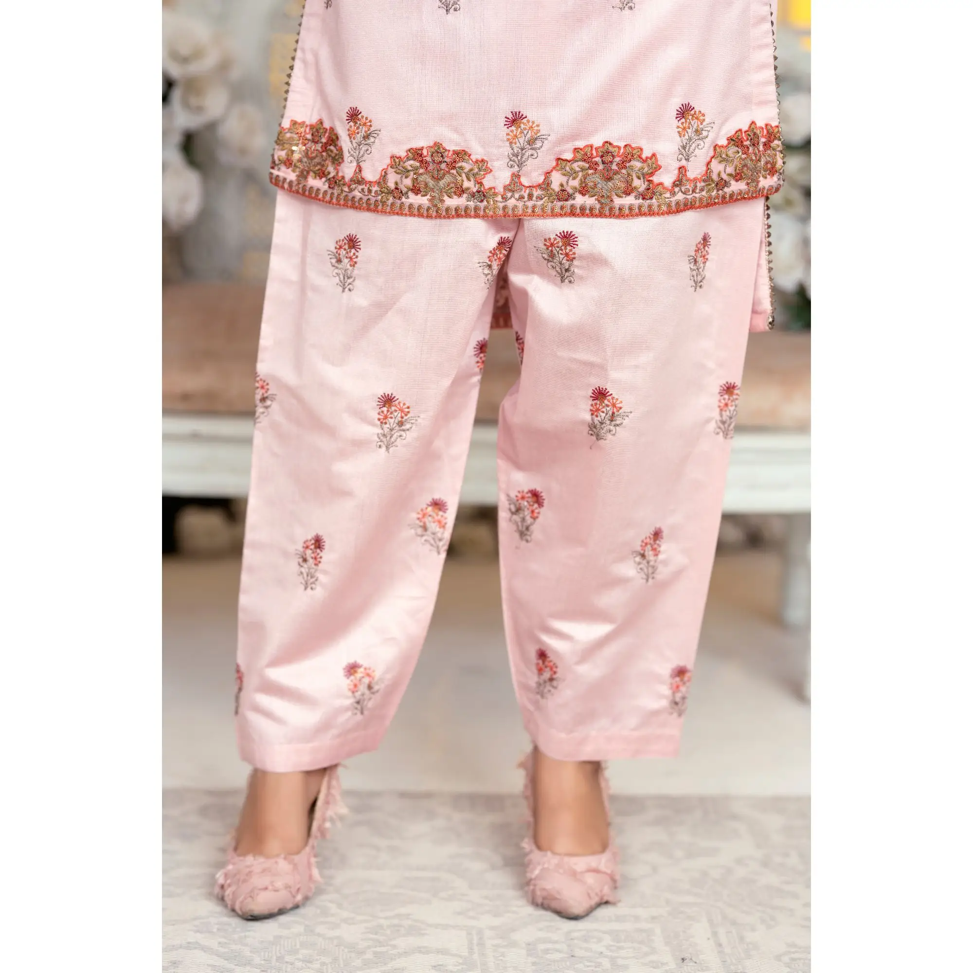A ready-to-wear ensemble crafted from premium quality viscose fabric. The shirt included in this set boasts intricate embroidery, adding a touch of elegance to the suit. The plain trousers complement the shirt perfectly, creating a polished look. This suit does not include a dupatta, giving you the freedom to accessorize as you wish. Perfect for any formal or semi-formal occasion, this suit is sure to make a lasting impression with its premium fabric. Upgrade your wardrobe with this luxurious piece today.