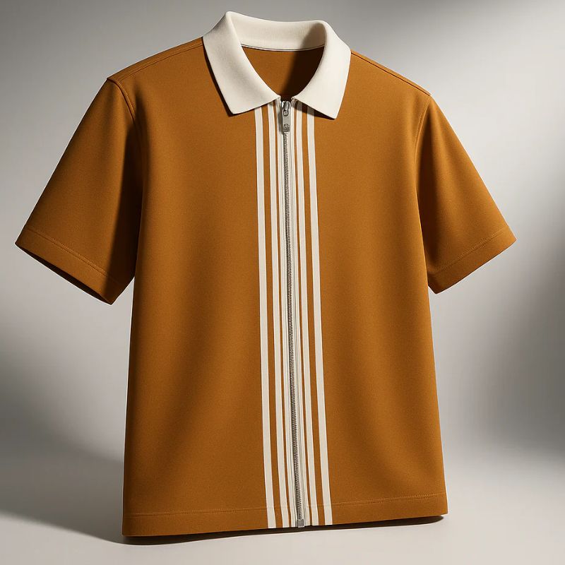 A Maroon striped polo shirt is a stylish and modern garment. It has a maroon base color with contrasting stripes, usually in black or white. The shirt features a zipper closure at the front adding a contemporary touch. It has a classic collar and short sleeves, making it suitable for casual occasions. The fit can range from slim-fit to regular-fit, depending on the brand. Overall, it's a versatile and fashionable choice for individuals looking for a twist on the traditional polo shirt design.