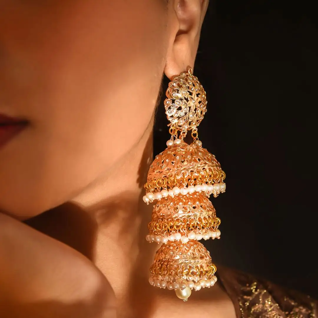| These Jhaalar-style Jhumkay are designed with a 22k gold polish on a copper base, lending an air of sophistication and creating a fusion of traditional and contemporary elegance. Adorned with glass stones and pearls, this timeless piece becomes even more stunning. |