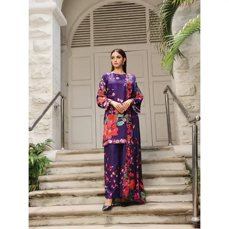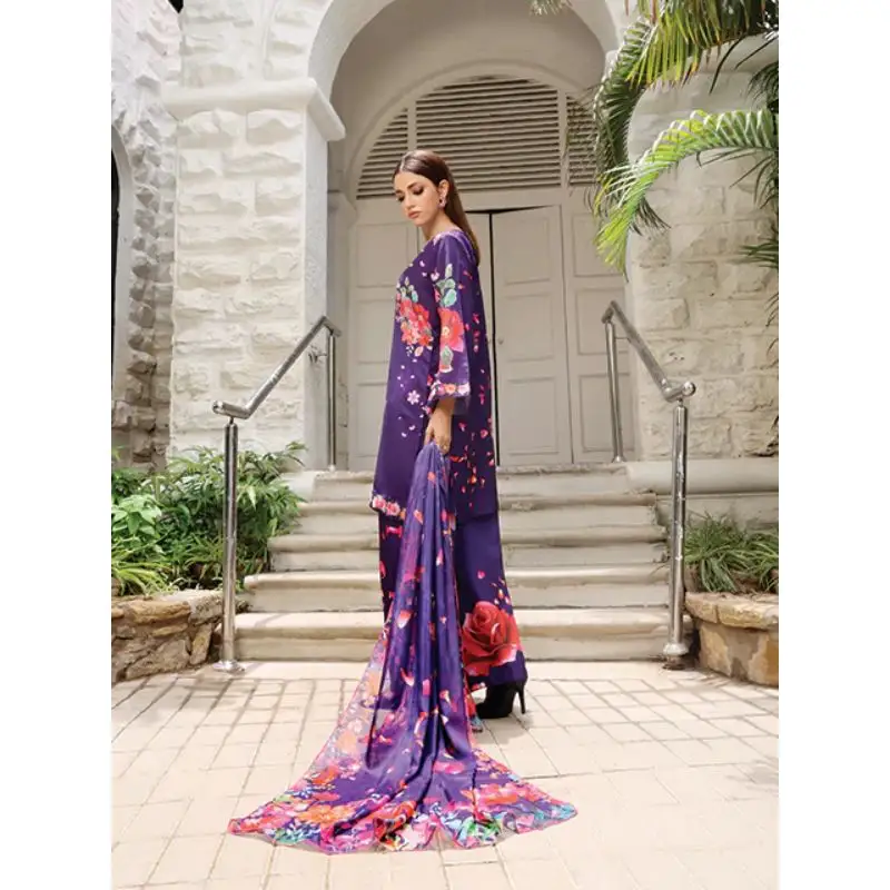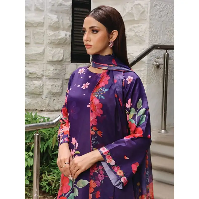 Discover Ephemeral. Swiss Lawn with a purple base, floral prints, and petal-detailed trousers. Paired with a soft silk dupatta with colorful floral borders. Perfect for a stunning summer look!