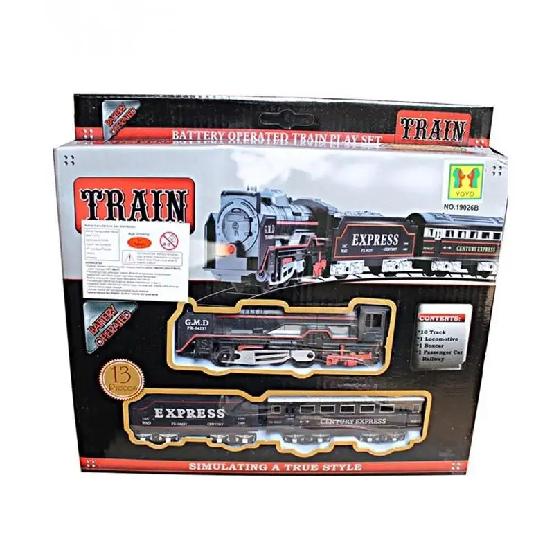 Perfect gift for kids, wonderful train toy Battery operated 13 Pcs train set with 2 engines 2 locomotives, and 10 sets of train tracks Headlight on engine gives a real feeling Track size 210 cm approximately diameter 67.5 cm
