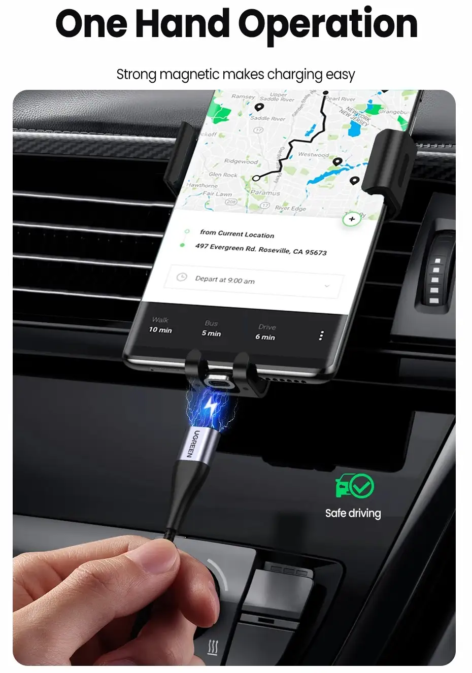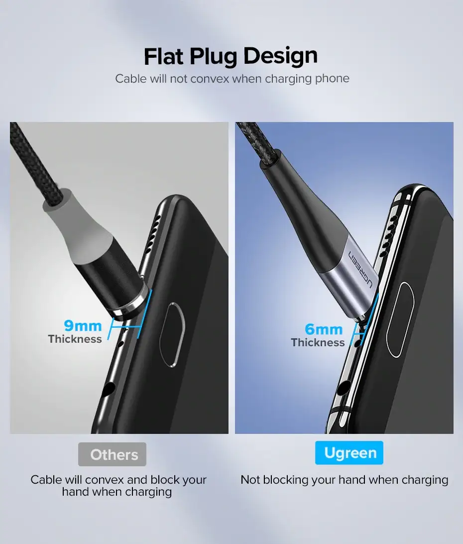 - Flat Plug Design: Not blocking your hand when charging