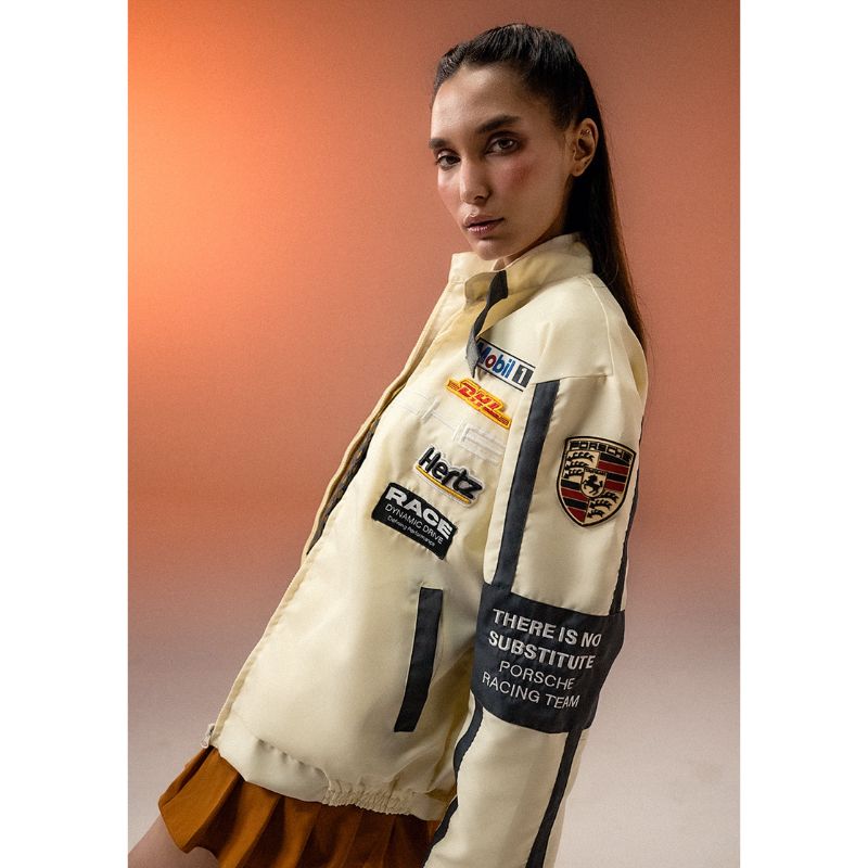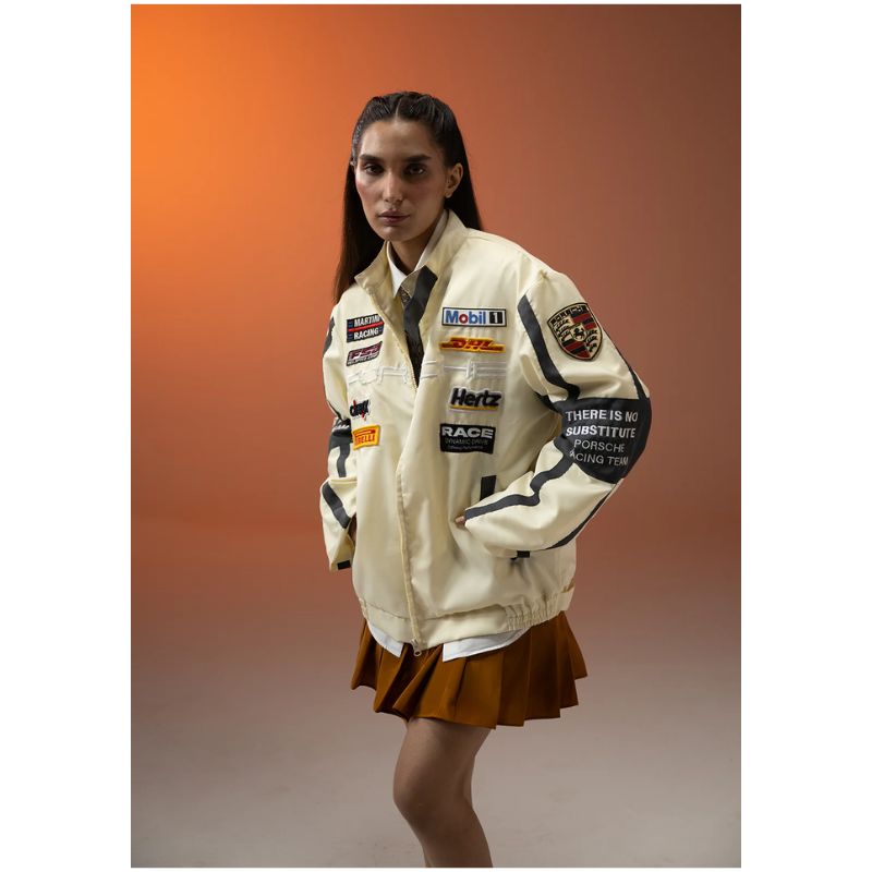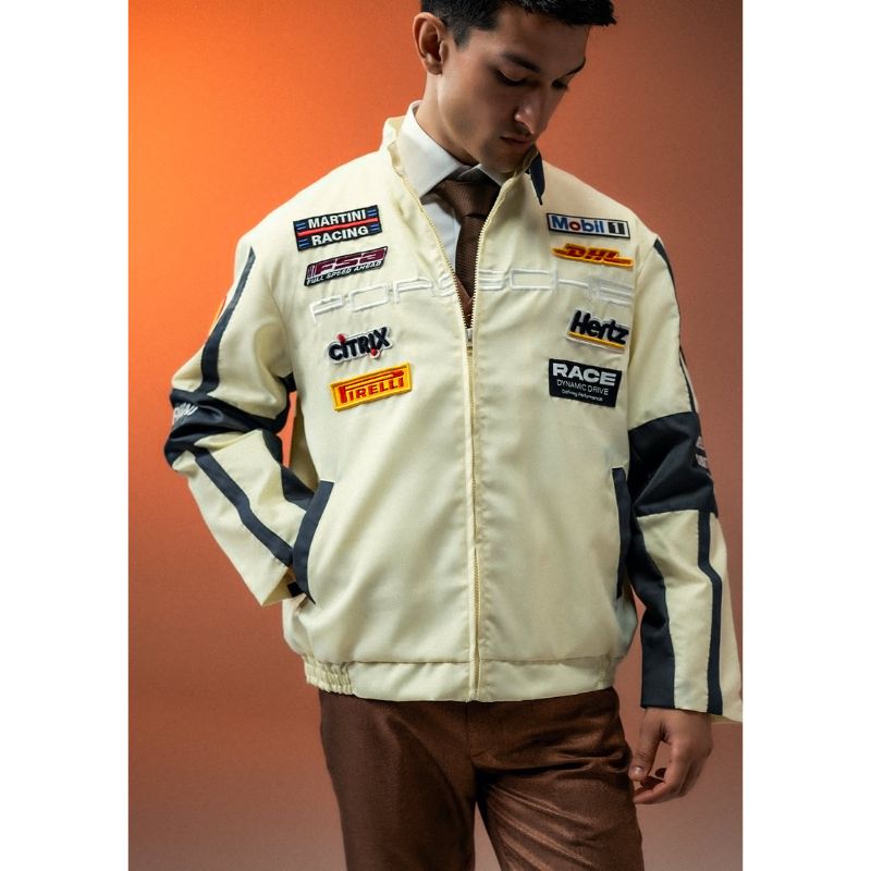The Apex Racer Beige & Grey Jacket combines premium style with racing heritage. Featuring Porsche front embroidery and automobile racing company patches, this unisex jacket offers a sleek, high-performance look in a versatile beige and grey color scheme. Crafted for both comfort and durability, itâs designed to keep you stylish on and off the track. Perfect for motorsport enthusiasts and fashion-forward individuals alike.